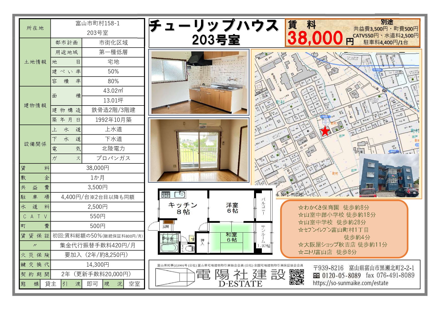 | 備考 | 毎月、定額水道料2,500円・町費500円・CATV550円が別途かかります。 賃貸保証料として、継続保証料(月払い)800円/月、集金代行振替手数料420円/月が保証会社より引き落とされます。 契約更新手数料20,000円(2年) |