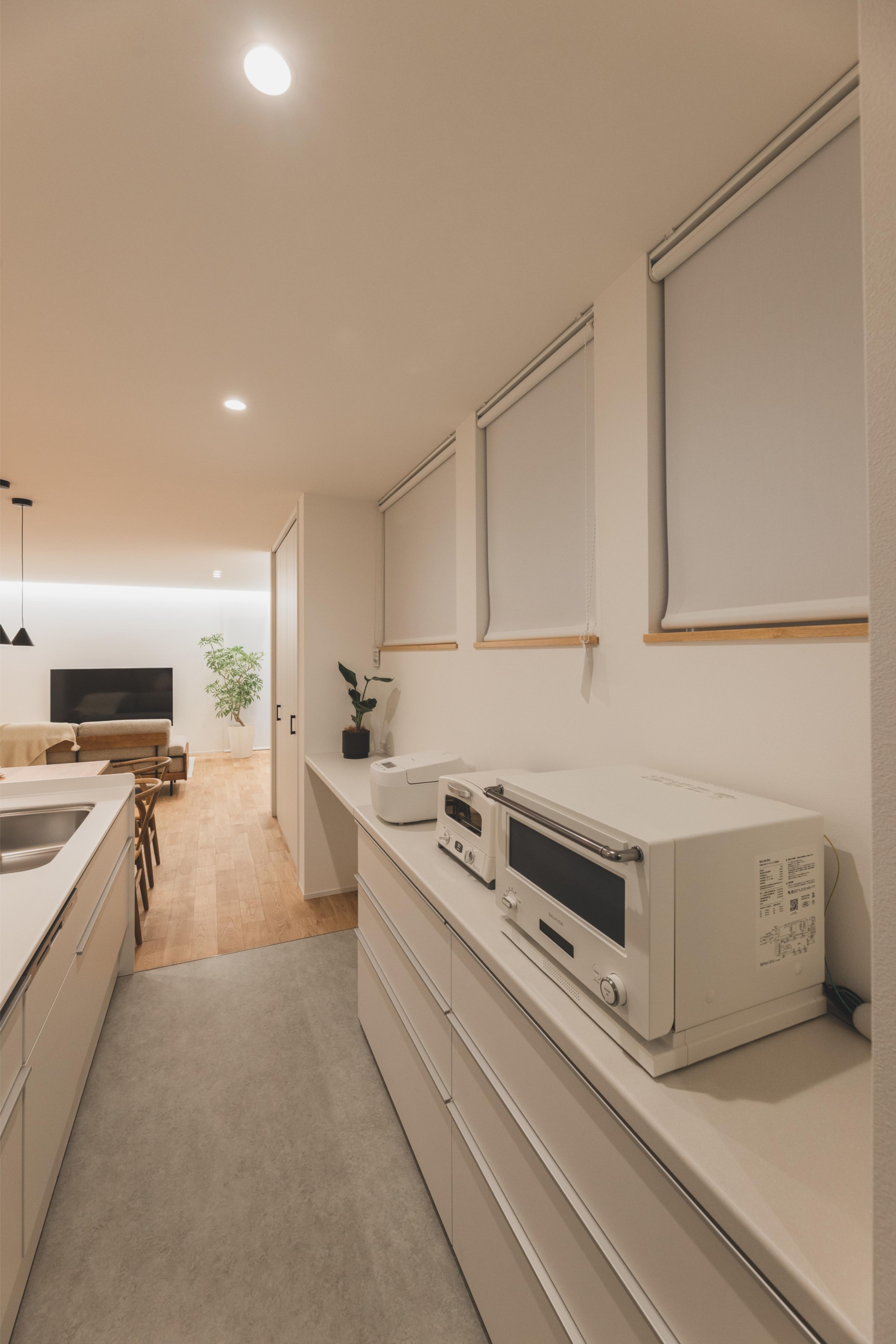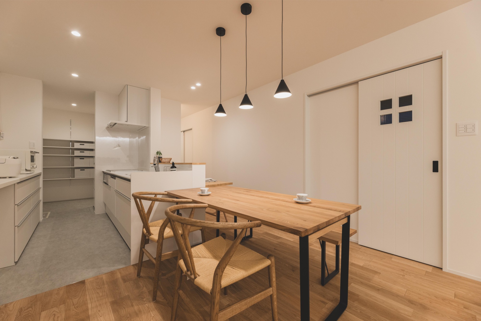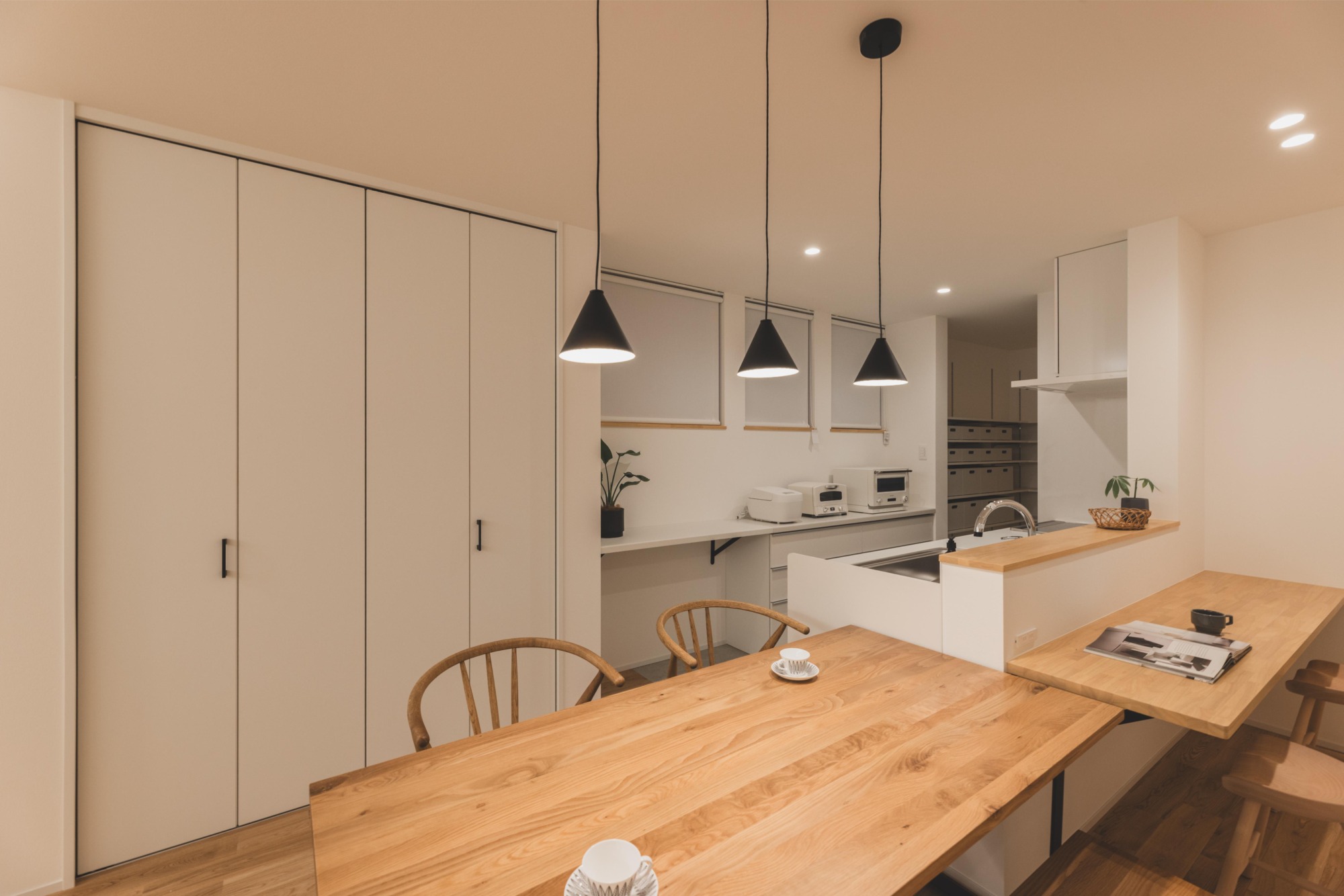 生活感の出やすい家電や小物を背面収納やパントリーに収めることで、ダイニングエリアを常に「見せたくなる場所」に。配膳や片付けが数歩で完結する横並びのキッチンとダイニングテーブルのレイアウトは、家事の負担を軽減します。