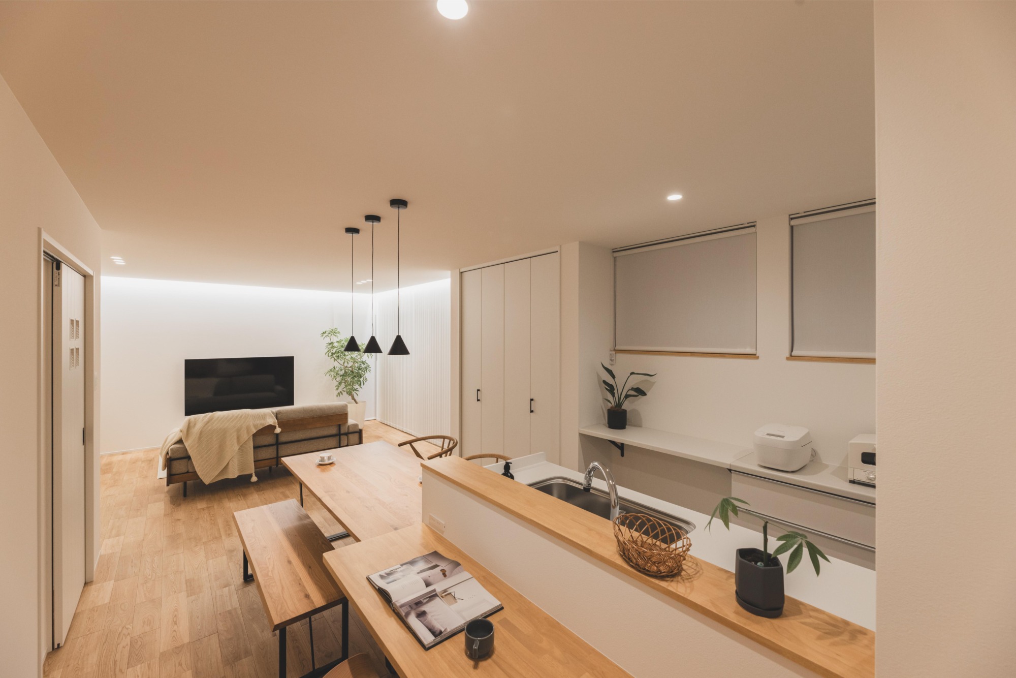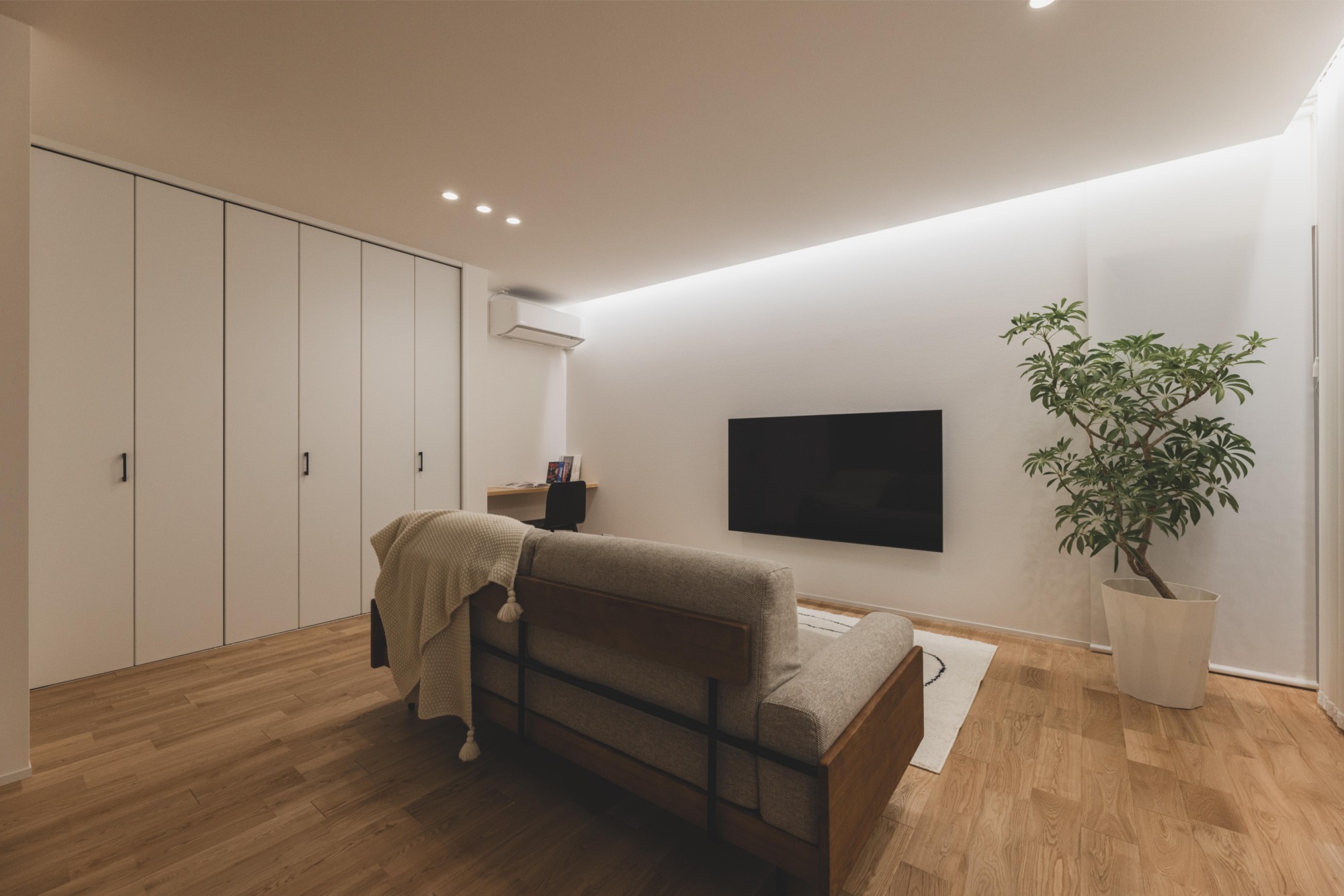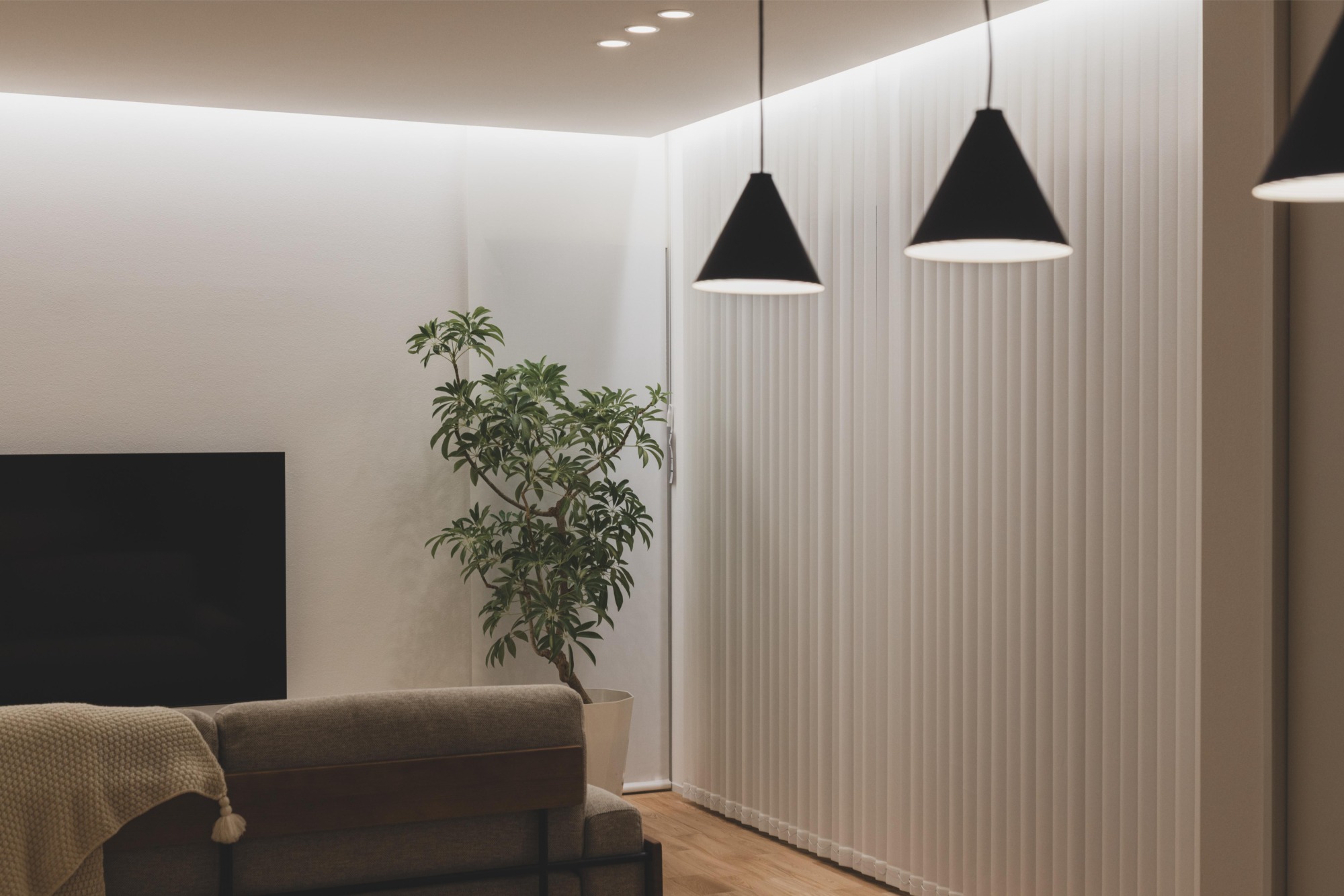 光と素材が織りなす、穏やかな日常の舞台。バーチカルカーテンのラインが空間に奥行きと柔らかなリズムを刻み、間接照明が天井を優しく照らして、空間全体を包み込みます。