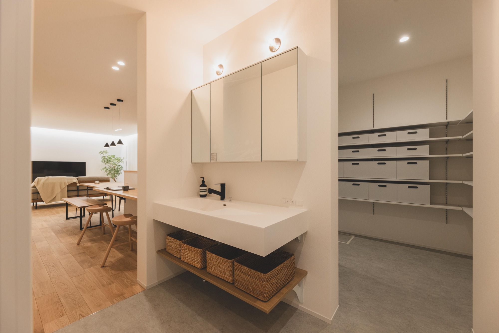 キッチンからパントリー、洗面所、そして廊下へと行き止まりなく繋がる回遊動線が、忙しい毎日にゆとりをもたらします 。